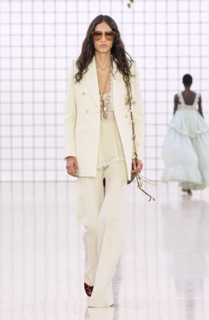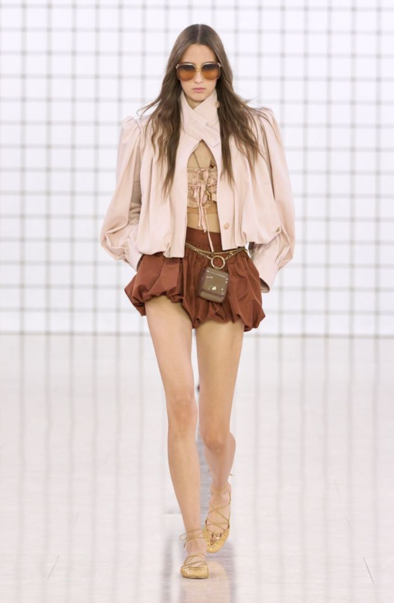 贯传本系列的内衣服装采用夏季面料特有的剪裁工艺制作以及精妙的比例。全新夹克的轮廓线条灵感源于飘逸褶边衬衫,褶状衣袖及廓形肩部设计均由棉帆布和绒面皮革制成。蕾丝边棉质罗纹亨利衫,呈现出精致的简约感,而标志性的70年代Chloé灯笼裤则散发出俏皮的气息。