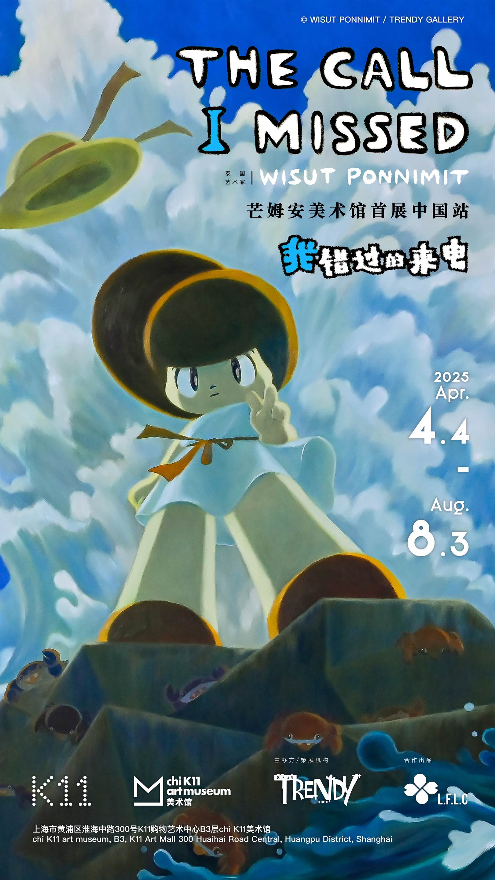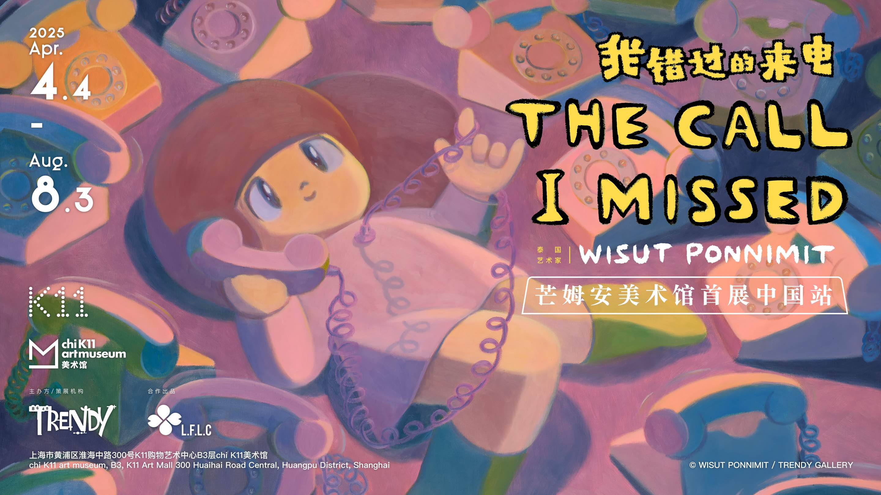 泰国知名艺术家WISUT PONNIMIT的中国首展《我错过的来电》(The Call I Missed)将于2025年4月4日至8月3日在上海chi K11美术馆举行。本次展览由K11美术馆与Trendy Gallery联合主办,呈现其标志性角色“芒姆安”(Mamuang)及多元艺术作品,包括绘画、雕塑、影像与互动装置。
